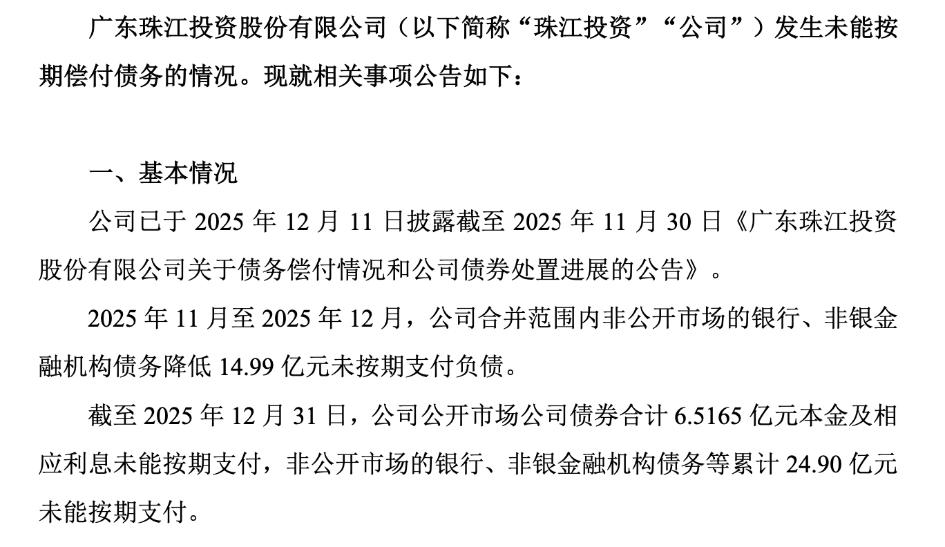 根据公司于2026年1月29日发布的公告及相关受托管理事务报告,截至2025年12月31日,珠江投资公开市场公司债券合计6.5165亿元本金及相应利息未能按期支付,非公开市场的银行、非银金融机构债务等累计24.90亿元未能按期支付,逾期债务总额高31.42亿元。