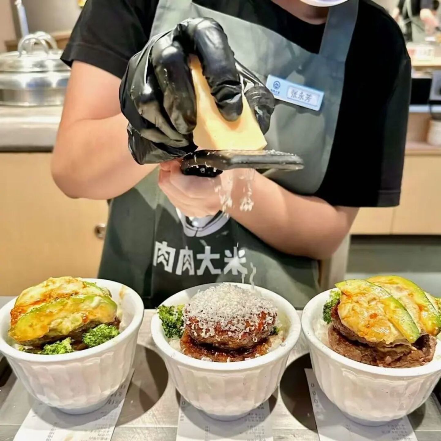 肉肉大米,现场研磨奶酪。(图源:小红书@饼子)