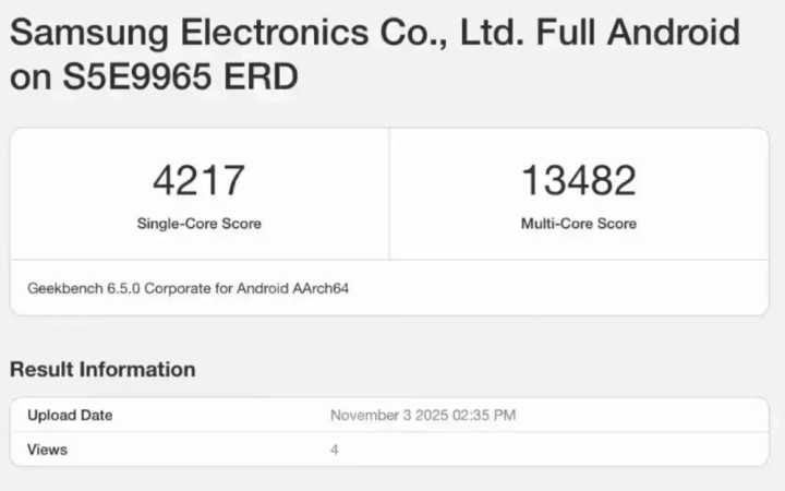 另一份则显示其单核成绩 4217 分,多核成绩 13482 分。就跑分成绩来看,其已经超越了第五代骁龙 8 至尊版,且单核性能媲美苹果 M5。