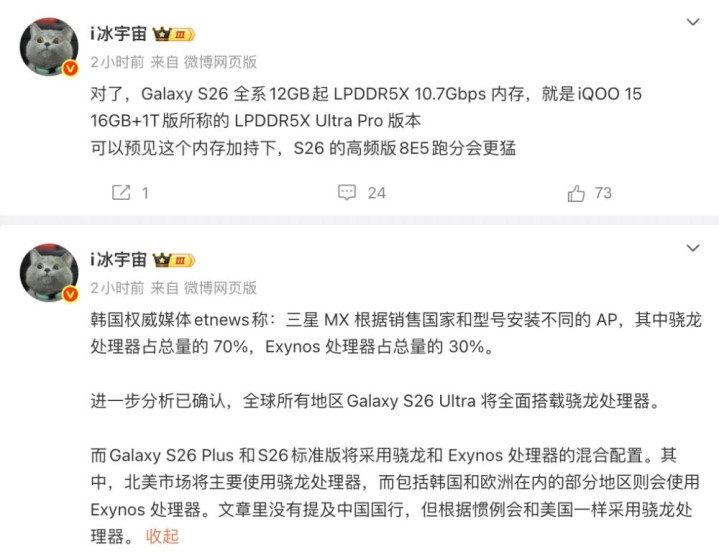 同时,这位博主的爆料还显示,Galaxy S26 Ultra 将在全球市场全面搭载骁龙处理器,Galaxy S26+和S26标准版将采用骁龙和 Exynos 处理器的混合配置。